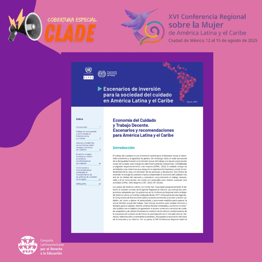 Durante la Conferencia Regional de la Mujer, CLADE destacó la importancia de visibilizar y posicionar el derecho humano a la educación en un espacio cuya agenda principal giró en torno a los cuidados. Para Nelsy Lizarazo, coordinadora general de CLADE, este escenario fue clave para continuar el trabajo que se impulsa desde la Asamblea de Tegucigalpa, en torno a la educación transformadora de género (ETG) y al reconocimiento de los cuidados como ejes que orientan la formación, la investigación y la incidencia regional.